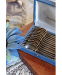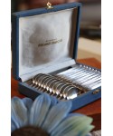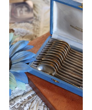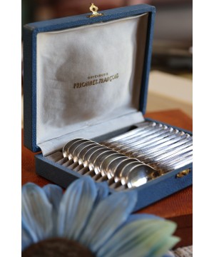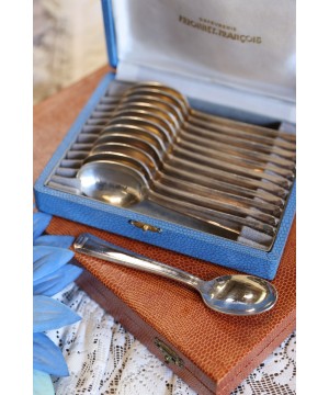 Superbe coffret ancien contenant 12 cuillères à dessert en métal argenté, signées Orfèvrerie Française : FRIONNET-FRANCOIS
