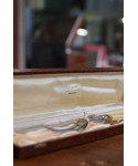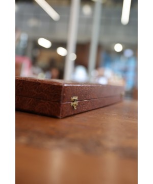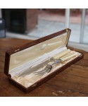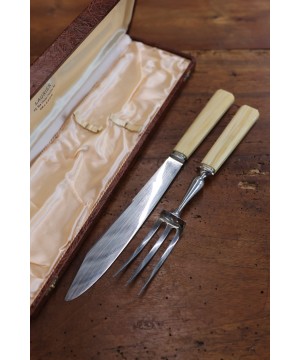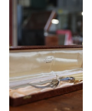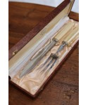 Élégant coffret de service à découper Laurier Valence, comprenant un couteau et une fourchette assortis, présentés dans leur étui d’origine en simili cuir. Les manches de couleur ivoire apportent une touche raffinée et rétro à cet ensemble typique de l’art de la table française.