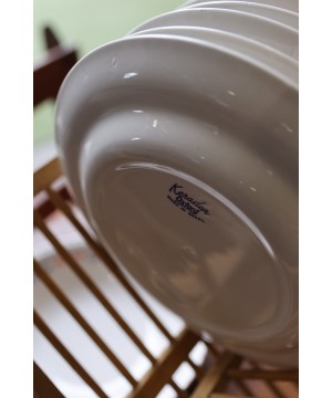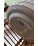 Ce bel ensemble en faïence blanche se compose de 6 assiettes plates, 6 assiettes creuses, 6 assiettes à dessert et d’un grand saladier assorti.
